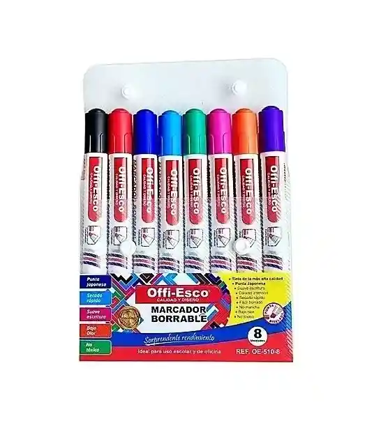 MARCADOR BORRABLE PAQUETE X 8 COLORES OFFI ESCO OE-510-8, ideal para uso escolar y de oficina., Suave escritura., 8 marcadores de colores intensos., Secado rápido., Fácil borrado. EAN 7709760116664