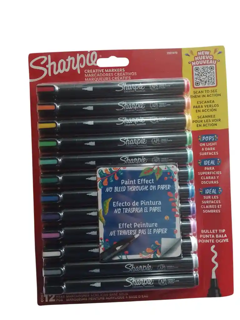 MARCADOR CREATIVO PUNTA BALA SHARPIE X12, 12 COLORES INTENSOS Y PERMANENTES. TRAZO FIRME Y UNIFORME, IDEAL PARA PAPEL, CARTÓN Y PROYECTOS CREATIVOS. SECADO RÁPIDO Y ALTA DURABILIDAD.