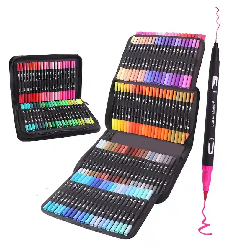 "Estuche Marcadores Doble Punta Pincel - Lettering 120pcs 1. COLORES ÚNICOS: Bolígrafos de doble punta que facilitan la selección del tono adecuado. Adecuados para Letras, bocetos, dibujo y libros para colorear. Tonos intensos y vivos que estimulan la creatividad artística. 2. DISEÑO DE PUNTAS DUAL: Punta de pincel para colorear, sombrear, rellenar y mezclar; punta fina de 0,4mm para un control de línea detallado en dibujo, escritura y delineado. 3. Portátil: Los marcadores están organizados en una funda fácil de transportar, lo que permite una selección de colores cómoda y práctica. 4. Amplia aplicación: Adecuados para una variedad de usos, incluyendo libros de colorear para adultos, dibujo, escritura, garabateo y más. Apropiados para niños, adultos, educadores, estudiantes, principiantes y para uso en la escuela, viajes o en casa y oficina."