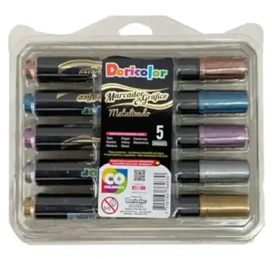 Son ideales para escribir, dibujar y decorar. – Marcan con un acabado brillante metálico sobre materiales porosos y no porosos como papel, cartón blanco o negro y vidrio. – Cada caja contiene seis colores diferentes. – Tinta lavable a base de agua. Punta tipo bala para trazos finos y suaves. – No son tóxicos Actua sobre Tela, Papel, Vidrio, Cerámica, Madera, Cartón