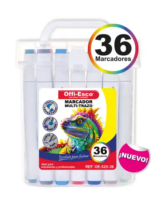 Marcador permanente multi-trazo Colores surtidos -Fácil apertura -Punta biselada y punta fina -Tinta permanente a base de alcohol -Excelente para ilustrar -Ideal para estudiantes y profesionales -Estuche x 36 Unds.