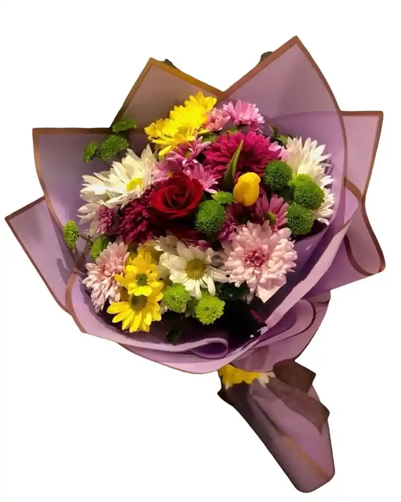 Ramo floral con 7 tallos de margaritas en tonos surtidos y 5 unidades de rosas en colores surtidos.