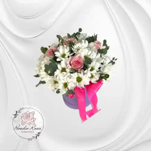 Arreglo floral con rosas rosadas, margaritas blancas o pompom blanco y follaje verde, refleja ternura y elegancia. Ideal para expresar amor, cariño, agradecimiento o sorprender en aniversarios, cumpleaños y fechas especiales.