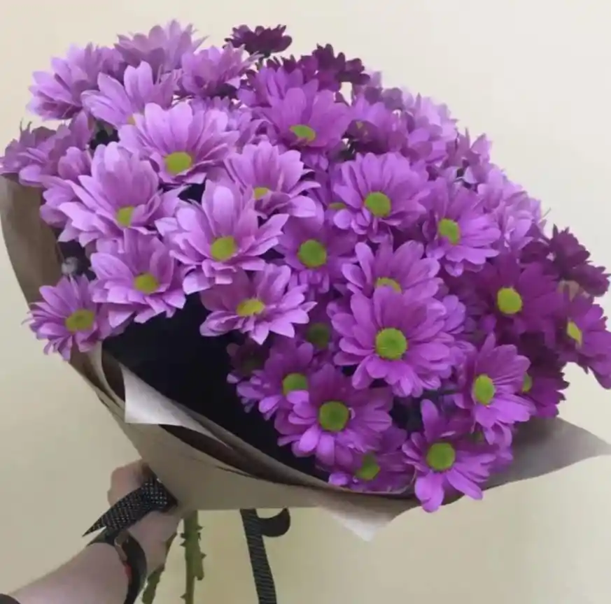 Bouquet con margaritas lilas, papel decorativo, moño, tarjeta con mensaje personalizado