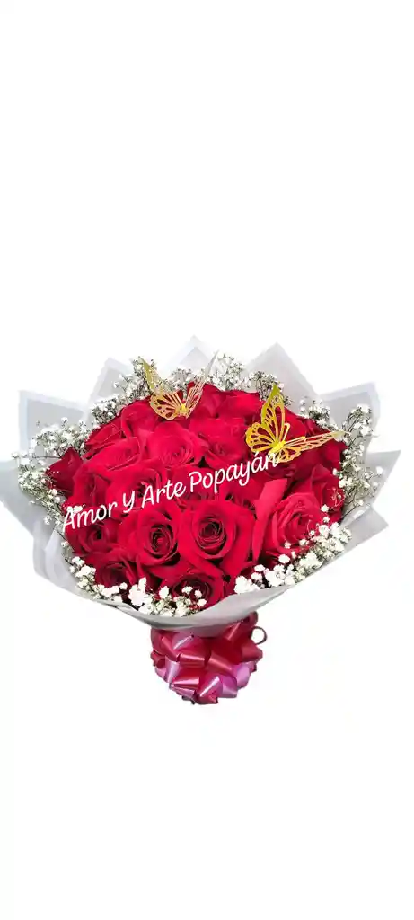 Ramo buchón de de rosas rojas con perla y mariposas. Incluye: Tarjeta con mensaje personalizado, moño, aroma y briilo.