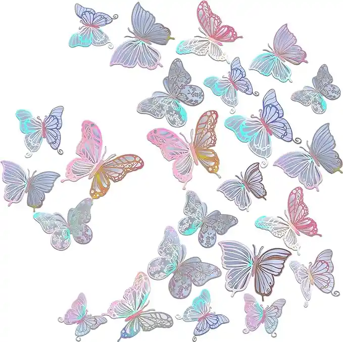 Paquete de 12 Mariposas de 3 tamaños diferentes en hermosos colores y brillantes traen puntos de silicona para pegarlas se envian color segun disponibilidad