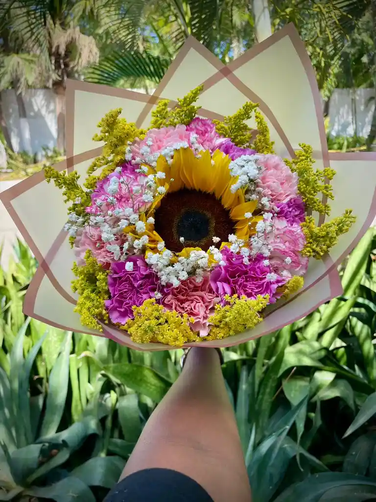 Un bouquet lleno de luz y ternura, protagonizado por un girasol radiante rodeado de claveles en tonos rosados y fucsia, delicadas flores blancas y toques dorados de solidago. Ideal para alegrar el día, celebrar un cumpleaños o sorprender a alguien especial con un detalle vibrante y elegante.