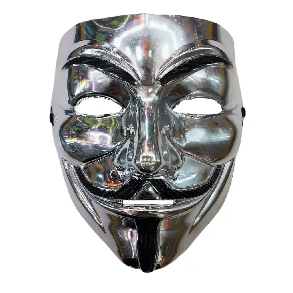 Descripción Icónica y reconocible al instante. Disponible en blanco, plata y dorado, esta máscara estilo Anonymous es ideal para disfraces, marchas, fiestas temáticas o eventos de misterio. Ligera, cómoda y con actitud rebelde. ¡Oculta tu identidad con estilo!