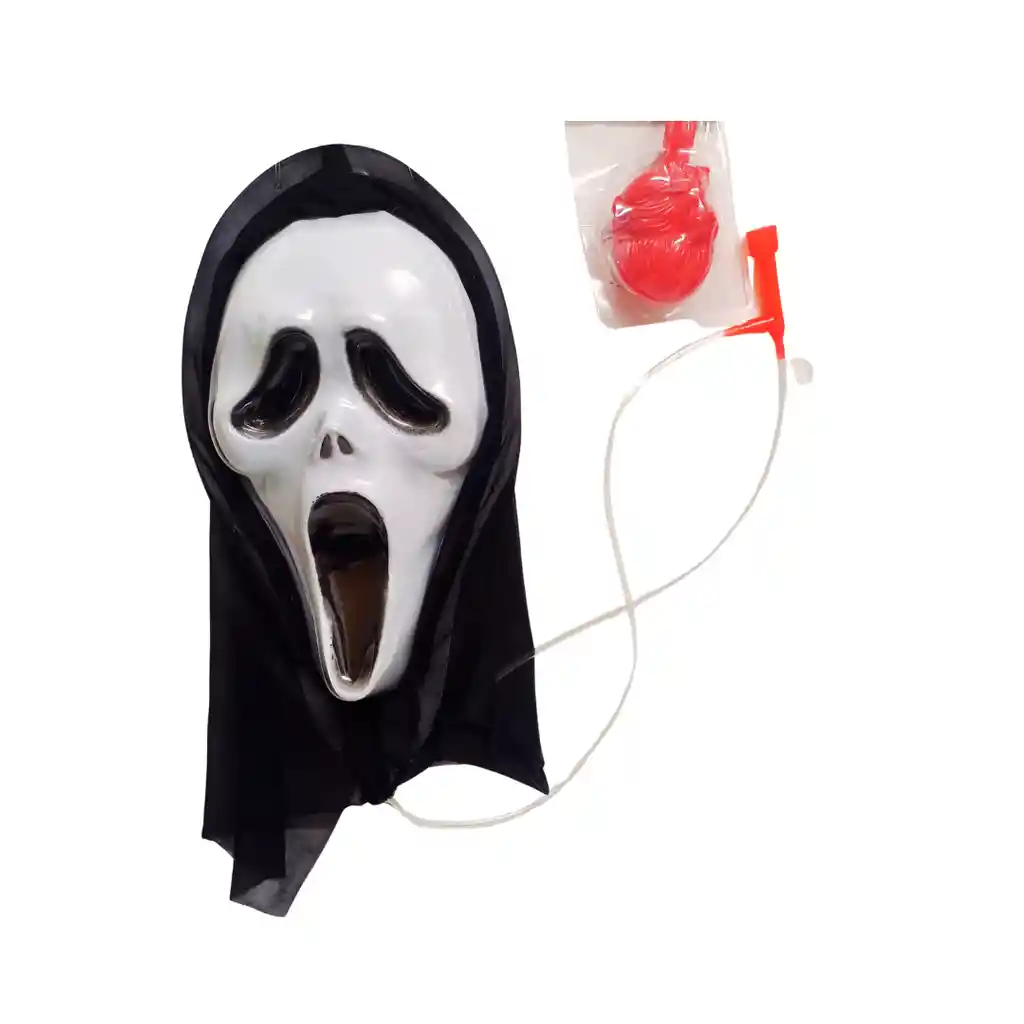Máscara de la Muerte con sistema que bombea sangre falsa para un efecto aterrador. Ideal para Halloween y disfraces impactantes. Diseño cómodo y fácil de usar.