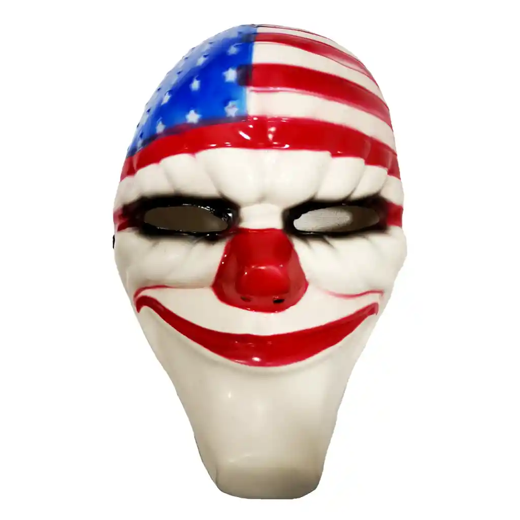 Máscara de payaso americano con diseño clásico y la bandera de Estados Unidos pintada en el rostro. Ideal para disfraces llamativos, Halloween y fiestas temáticas. Cómoda, resistente y con gran impacto visual.