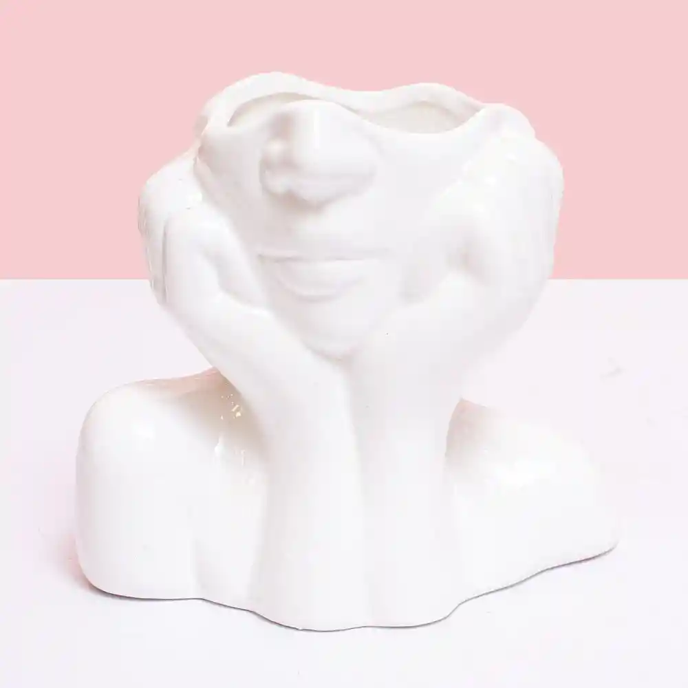 Maceta decorativa en cerámica blanca de acabado brillante, que representa un rostro humano en posición pensativa, con las manos apoyando la cara. El diseño escultórico y minimalista la convierte en una pieza contemporánea ideal para realzar cualquier espacio moderno. Apta para plantas pequeñas o como elemento decorativo independiente.
