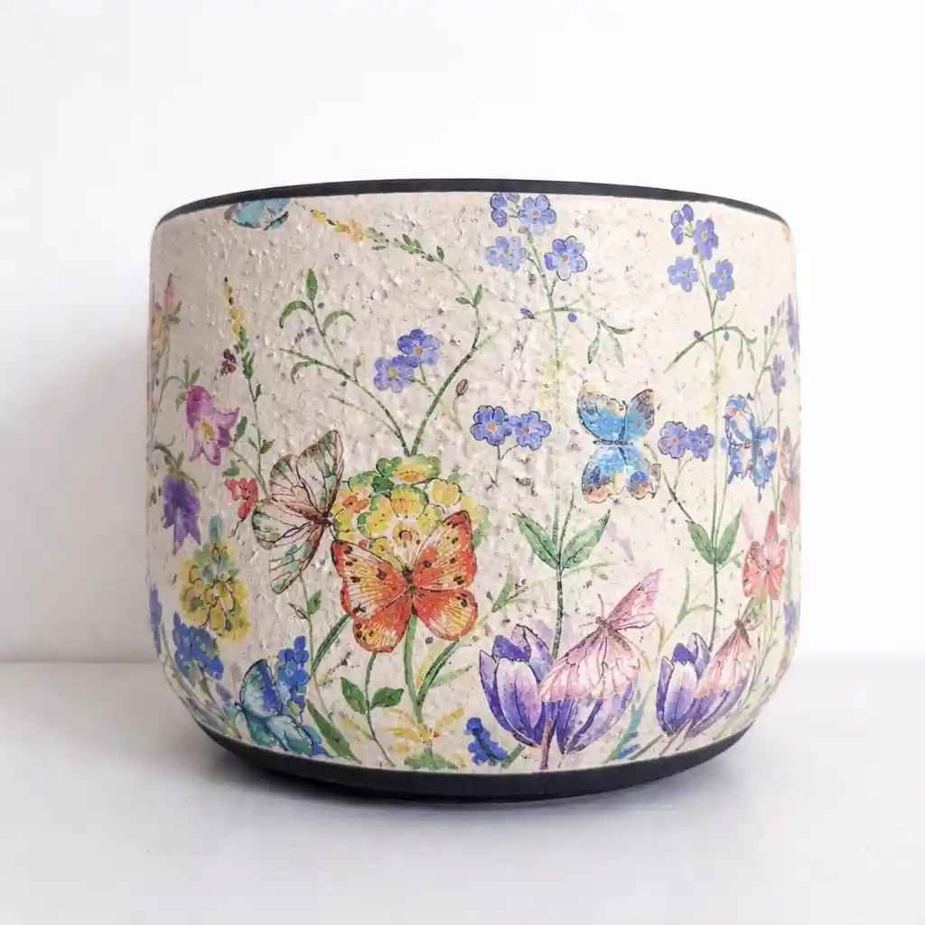 Matera de plástico transformada con patas remachadas, decorada, estampada e impermeabilizada.