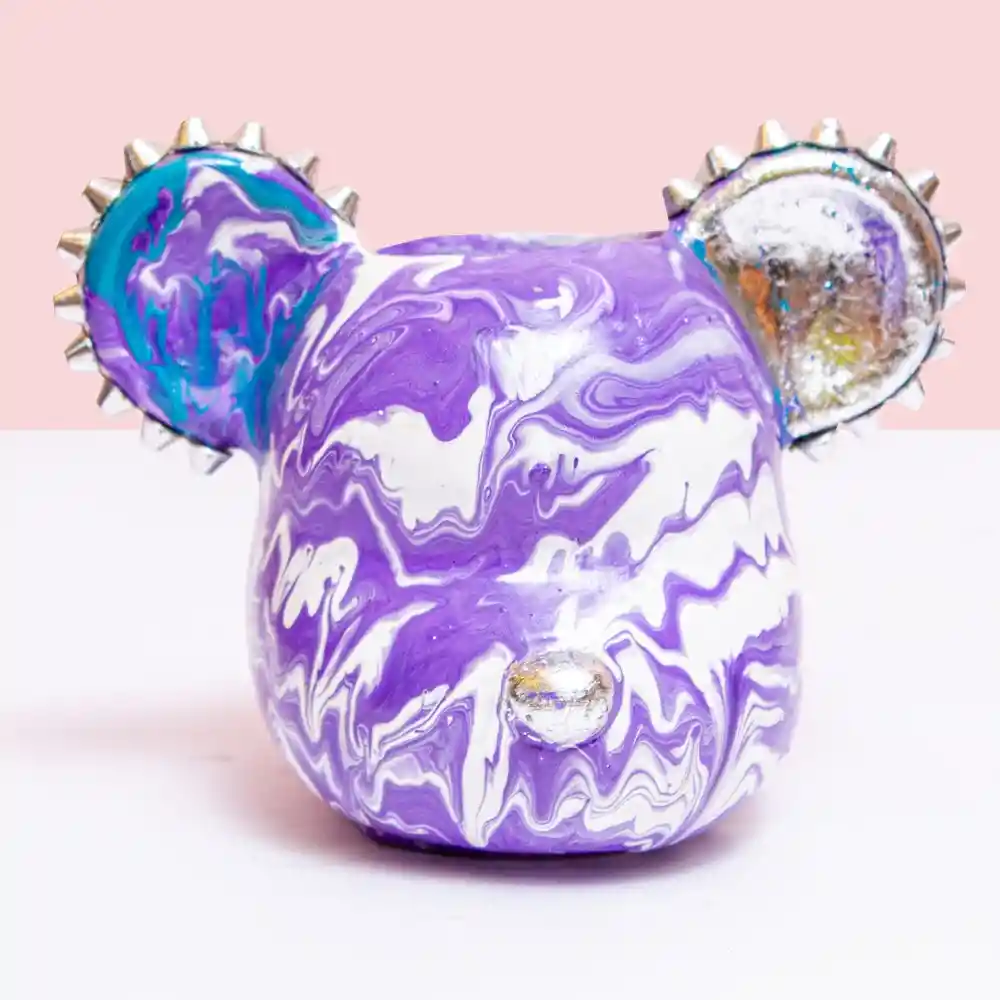 Se trata de una escultura de cerámica con forma redondeada, que recuerda vagamente a una cabeza de oso estilizada. Tiene dos prominencias laterales circulares que asemejan orejas, ambas rodeadas por una serie de picos metálicos plateados que les dan un aspecto mecánico o industrial. El acabado superficial presenta un patrón fluido de colores morado, blanco y toques de azul, con un efecto marmoleado brillante. En la parte frontal inferior, hay una pequeña protuberancia redonda metálica, de acabado plateado con un leve toque dorado, que rompe la continuidad del patrón. El interior de las orejas y la protuberancia tienen un acabado reflectante metálico, lo que contrasta con el fondo mate brillante del cuerpo principal.