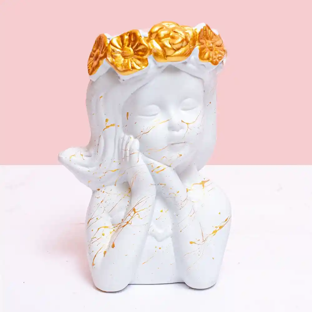 Esta Matera de Rostro Femenino irradia un encanto etéreo y artístico. La pieza principal, en un sereno blanco, presenta una figura con un gesto de dulzura y ensueño. Destaca su corona de flores en relieve bañada en un vibrante color dorado, un detalle que añade un toque regio y romántico. El acabado se complementa con salpicaduras artísticas de pintura dorada que le confieren un aire moderno y bohemio. Es ideal para plantar especies colgantes que simulen el cabello, como Sedum morganianum o Ceropegia woodii, creando un regalo inolvidable y lleno de personalidad.