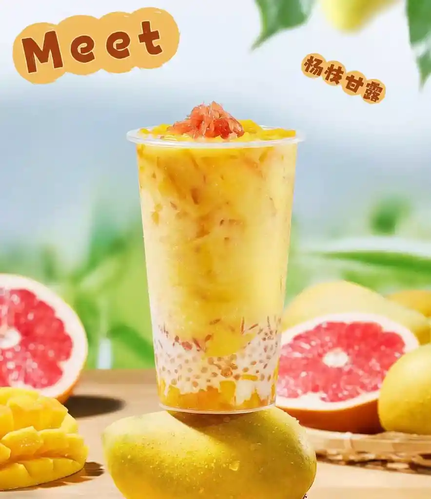 Esta es una bebida hecha de leche, leche de coco, mango, pomelo, sago y azúcar. ( Las personas que son alérgicas a los alimentos anteriores no deberían comprarlos. Las flores son solo decoraciones y no deben comerse). La fruta de la imagen se ajustará de acuerdo con el agua dulce del día.