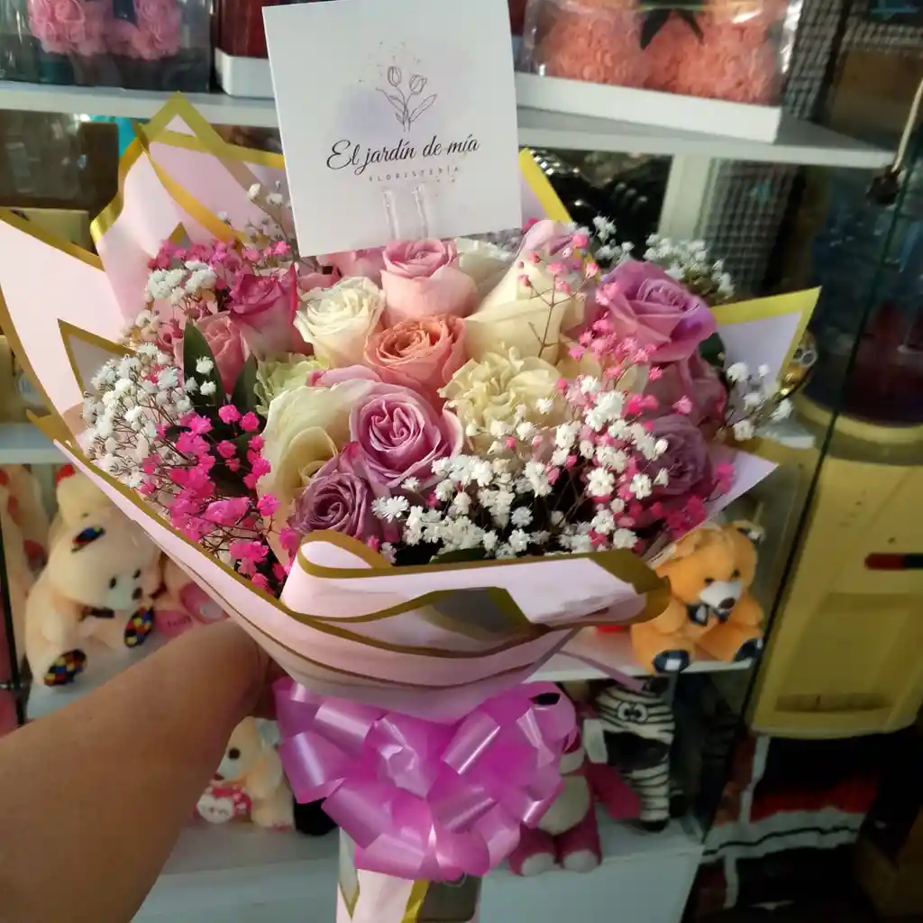 ramillete de una docena de rosas con gipso, envuelto en papel coreano moño y tarjeta