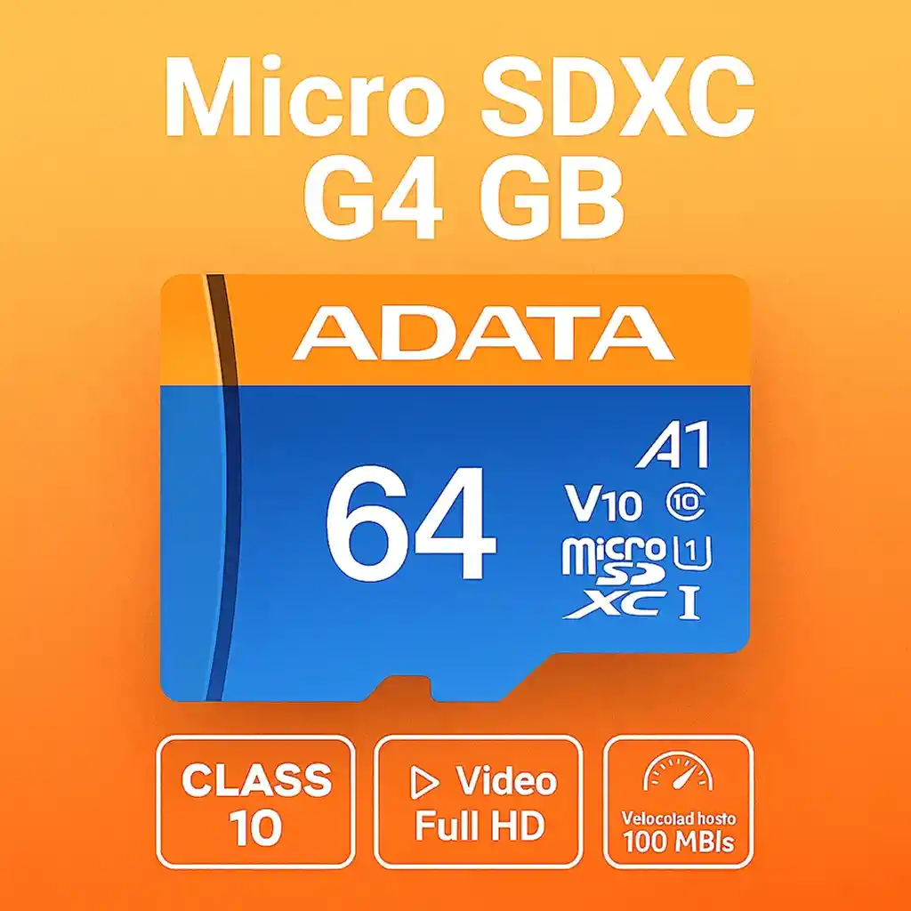 💾 Tarjeta de Memoria ADATA microSDXC 64GB con Adaptador | UHS-I Clase 10 La ADATA microSDXC de 64GB con adaptador SD incluido es ideal para ampliar la capacidad de almacenamiento en smartphones, tablets, cámaras, drones y otros dispositivos compatibles. Ofrece velocidades de transferencia rápidas y confiables, perfectas para grabar y reproducir video en Full HD y almacenar miles de fotos, canciones o aplicaciones. Características principales: 📸 Capacidad de 64GB: espacio suficiente para fotos, música, apps y videos. 🎥 Compatible con grabación Full HD (1080p): clase de velocidad UHS-I U1 / Clase 10. ⚡ Velocidad de lectura hasta 100 MB/s: transferencia de archivos rápida y eficiente. 📱 Incluye adaptador SD: mayor compatibilidad con laptops, cámaras digitales y más. 🛡️ Alta resistencia: diseño a prueba de agua, golpes, rayos X, temperaturas extremas (-25°C a 85°C) y antiestático. 🏷️ A1 App Performance: optimizada para un mejor rendimiento en aplicaciones móviles. Usos recomendados: ✔️ Almacenamiento y grabación en smartphones y tablets. ✔️ Cámaras de acción, drones y cámaras digitales con soporte para microSDXC. ✔️ Grabación y reproducción de video en alta definición (Full HD). ✔️ Transferencia segura de archivos entre dispositivos mediante el adaptador incluido.