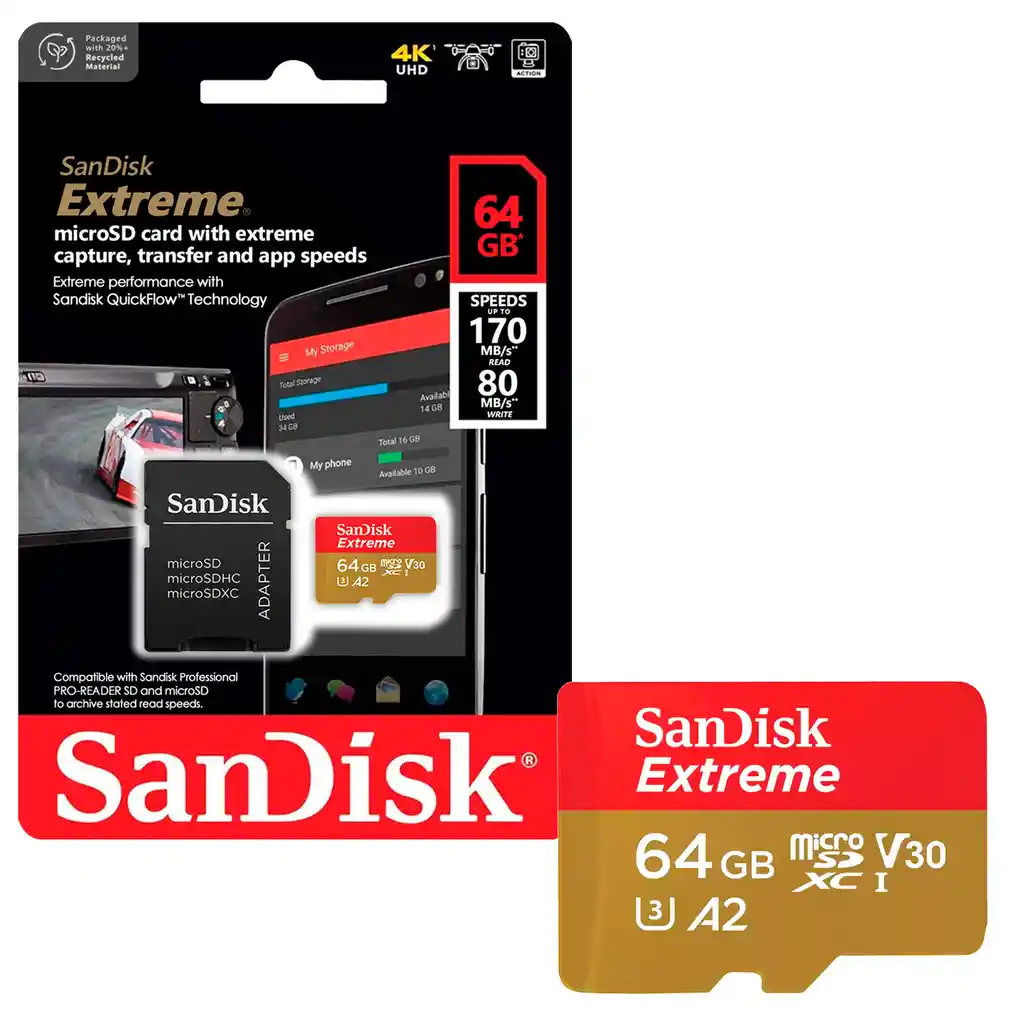 Captura y almacena momentos sin límites con la Tarjeta de Memoria MicroSDXC SanDisk Extreme Diseñada para satisfacer las necesidades de los creadores de contenido y los entusiastas de la fotografía y el video que buscan capturar momentos en calidad 4K sin comprometer la velocidad ni la capacidad de almacenamiento. Rapidez suficiente para continuar con la acción La tarjeta de memoria SanDisk Extreme® microSDXC™ permite ahorrar tiempo en la transferencia de archivos multimedia con velocidades de lectura hasta 190 MB/s gracias a la tecnología SanDisk® QuickFlow™ (de 64 TB a 1 TB). Perfecta para capturar videos 4K UHD Este dispositivo te permite capturar videos 4K UHD y full HD sin interrupciones, gracias a sus clasificaciones de velocidad UHS clase 3 (U3) y velocidad de video clase 30 (V30). Carga aplicaciones más rápido con A2 Obtén un rendimiento de las aplicaciones más rápido para disfrutar de una experiencia única con tu teléfono inteligente gracias a la especificación A2 de la tarjeta SanDisk Extreme® microSD. Especificaciones • Capacidad de Almacenamiento: 64 GB • Incluye adaptador SD: Sí • Formato de la tarjeta: MicroSDXC •