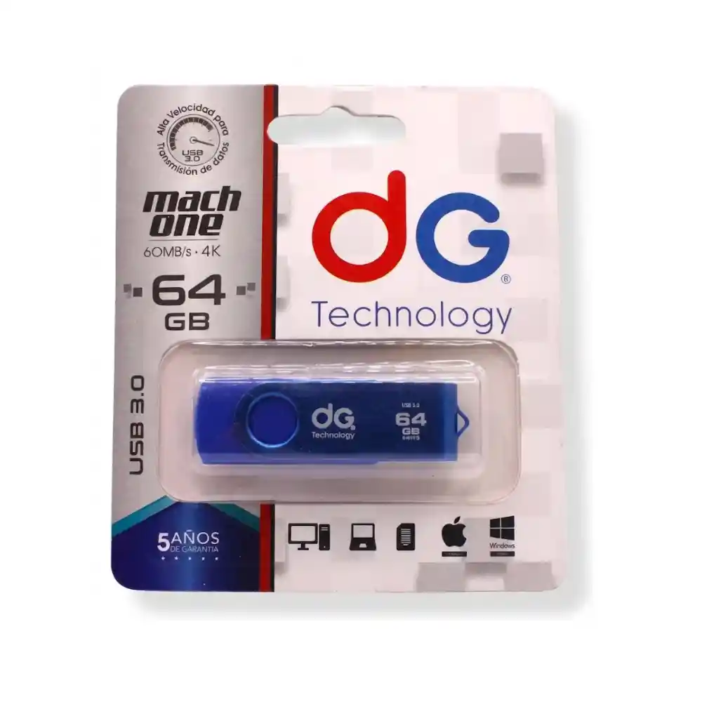 Memoria Usb 64gb Usb 3.0 Dg Original Memoria USB 3.0 64GB DG Technology Dispositivo USB de 64GB, funciona en gran variedad de computadores, televisores, reproductores de música y video. Tu información siempre a mano en cualquier momento y lugar. - Velocidad de lectura de 14 MB/s y de escritura de 4 MB/s. - Temperatura de funcionamiento 0°C a 60°C. - Temperatura de almacenamiento -25°C a 85°C. - Potencia Vcc: 4.5 - 5.5 VDC. - Compatible con sistemas Windows 2000 hasta Windows 10, Mac OS: 10,3 o Superior.