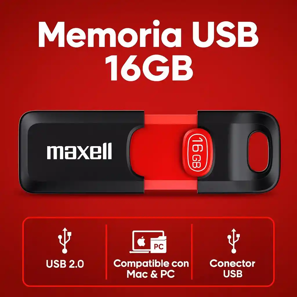 💻 Memoria USB Maxell USBFlix 16GB – Compatible con Mac & PC La USB Maxell USBFlix de 16GB es una unidad de almacenamiento práctica, compacta y confiable, diseñada para guardar, transferir y transportar tus archivos de manera sencilla. Su diseño retráctil protege el conector y la hace fácil de llevar a cualquier lugar. Características principales: 💾 Capacidad de 16GB: ideal para almacenar fotos, música, videos y documentos. 🔌 Interfaz USB 2.0: compatible con cualquier puerto USB estándar. 🖥️ Compatibilidad universal: funciona en sistemas Windows y Mac. 🎵 Almacenamiento versátil: permite guardar aproximadamente hasta 5600 fotos, 2760 canciones o 960 minutos de video en calidad estándar (según el fabricante). 🧩 Diseño retráctil y compacto: protege el conector y evita el uso de tapas que puedan perderse. Usos recomendados: ✔️ Transportar y respaldar documentos importantes. ✔️ Guardar música, fotos y videos para uso personal o escolar. ✔️ Transferir archivos entre computadoras y otros dispositivos. ✔️ Uso práctico en oficinas, estudios o viajes. ⚠️ Nota importante: Esta memoria es USB 2.0, por lo que ofrece una velocidad estándar de transferencia. Para un uso óptimo, se recomienda respaldar la información en otros medios, ya que el fabricante no garantiza la recuperación de datos en caso de falla.
