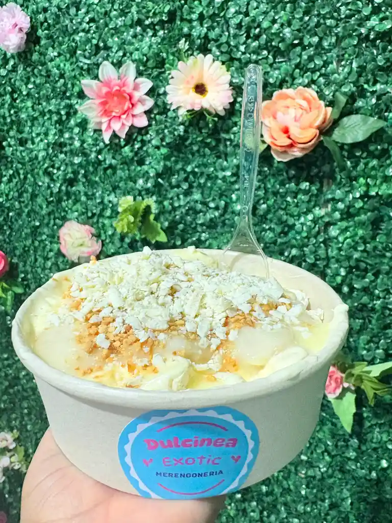 1 CAPA DE MINIMERENGONES, CREMA DE LECHE, 390 GRAMOS DE FRUTA, 2 SALSA 3 TOPPING