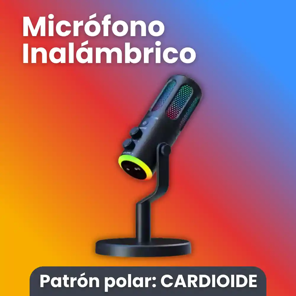 El SU8W es un micrófono condensador USB de escritorio con conexión inalámbrica mediante receptor USB, iluminación RGB tipo breath lights y patrón polar cardioide, diseñado para grabación de voz clara en streaming, clases virtuales, llamadas y creación de contenido. ⚙️ Características principales ✦ Micrófono condensador de escritorio ✦ Conexión inalámbrica USB mediante receptor incluido ✦ Patrón polar cardioide (captura frontal, reduce ruido ambiente) ✦ Iluminación RGB Breath Lights integrada ✦ Control físico de volumen ✦ Control de eco ✦ Botón mute / encendido ✦ Monitoreo por audífonos en tiempo real ✦ Base metálica estable para escritorio ✦ Brazo ajustable desmontable 📦 Incluye ✦ Micrófono condensador SU8w ✦ Base metálica de escritorio ✦ Brazo soporte ajustable ✦ Receptor inalámbrico USB ✦ Cable de carga USB ✦ Manual de usuario 📐 Especificaciones técnicas ✦ Modelo: SU8w ✦ Tipo: Micrófono condensador USB ✦ Conectividad: Inalámbrica vía receptor USB ✦ Patrón polar: Cardioide ✦ Iluminación: RGB (efecto respiración) ✦ Controles: Volumen, Eco, Mute / encendido ✦ Monitoreo: Puerto para audífonos ✦ Alimentación: Batería interna recargable ✦ Puerto de carga: USB ✦ Formato: Escritorio ✦ Certificaciones: CE, FCC, RoHS ⚠️ No se especifican oficialmente tasa de muestreo, bits o rango de frecuencia en el empaque ni manual, por lo que no se declaran. 💡 Ideal para ✦ Streaming básico y creación de contenido ✦ Clases virtuales y videollamadas ✦ Podcasts sencillos ✦ Grabación de voz hablada ✦ Usuarios que buscan comodidad inalámbrica y estética RGB ✦ Escritorios de home office o setups gamer ligeros