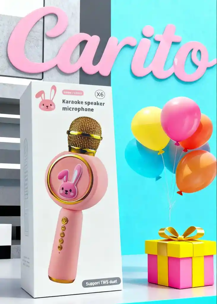 Características principales - Diseño adorable: Color rosa con detalle de personaje infantil en la parte frontal, ligero y ergonómico para manos pequeñas. - Inalámbrico y portátil: Conectividad Bluetooth, sin cables que limiten el juego se puede usar en casa, fiestas o viajes. - Funciones múltiples: Actúa como micrófono, altavoz y tiene efectos de voz divertidos (eco, cambio de tono). - Material seguro: Fabricado con plásticos no tóxicos y esquinas redondeadas, apto para niños a partir de 3 años. - Batería duradera: Carga USB, hasta 4 horas de uso continuo con una sola carga.