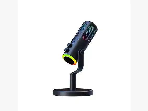 dispositivo de condensador diseñado para streaming, juegos y podcasting, que destaca por su iluminación RGB, patrón polar cardioide para reducir el ruido de fondo y controles integrados de volumen/eco. Es una opción plug and play con conexión USB, compatible con PC y MAC, ideal para creadores de contenido que buscan calidad nítida