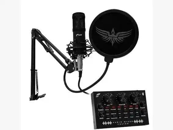 Incluye un micrófono de condensador cardioide con luz RGB, cancelación de ruido ajustable, y un brazo articulado, junto con una consola mezcladora (mixer) que permite gestionar la ganancia, eco y monitoreo en tiempo real.