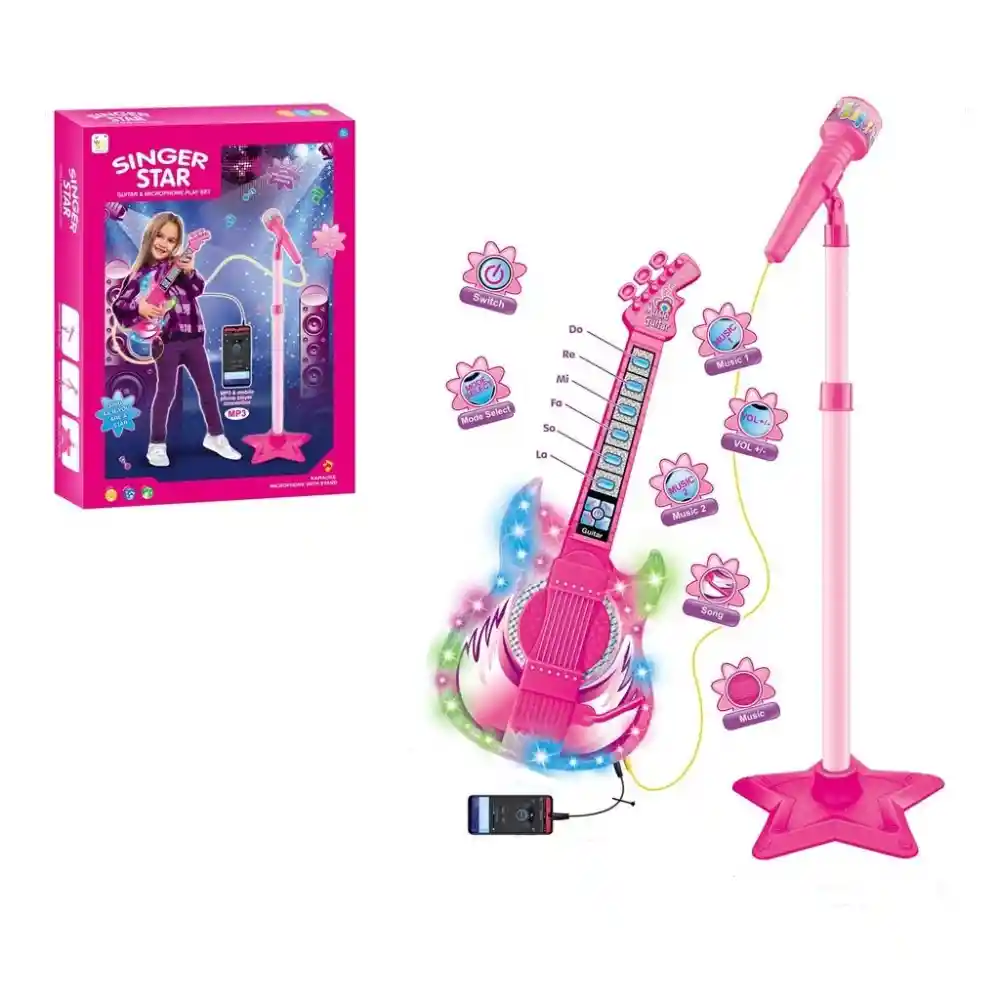 NOMBRE: MICROFONO Y GUITARRA CAJA DESCRIPCION: Diversión musical asegurada con este kit Espectacular de Micrófono y Guitarra, ideal para que los niñas se sientan como estrellas musicales, mientras juegan y se entretienen con sus amigas. Este juego ayuda a despertar el interés de los niños por la música, desarrollando el sentido del ritmo, la observación y la concentración, creando una vía de expresión de sentimientos y emociones en los niños, mientras aumentan su socialización. Requiere 3 pilas AA no incluidas. - Dimensiones del producto empacado: 5,5 X 43,5 X 32 centímetros - Disponibilidad permanente - Despachos a nivel nacional - Tiempo de entrega aproximado 3 a 4 días hábiles contados a partir del día hábil siguiente al pedido. La plataforma te dará un tiempo de entrega mas preciso al momento de concretar la compra. Estamos atentos a resolver cualquier inquietud que tengas después de revisar las fotos y descripción del producto. JUGUETELANDIA más de 30 años ofreciendo diversión.
