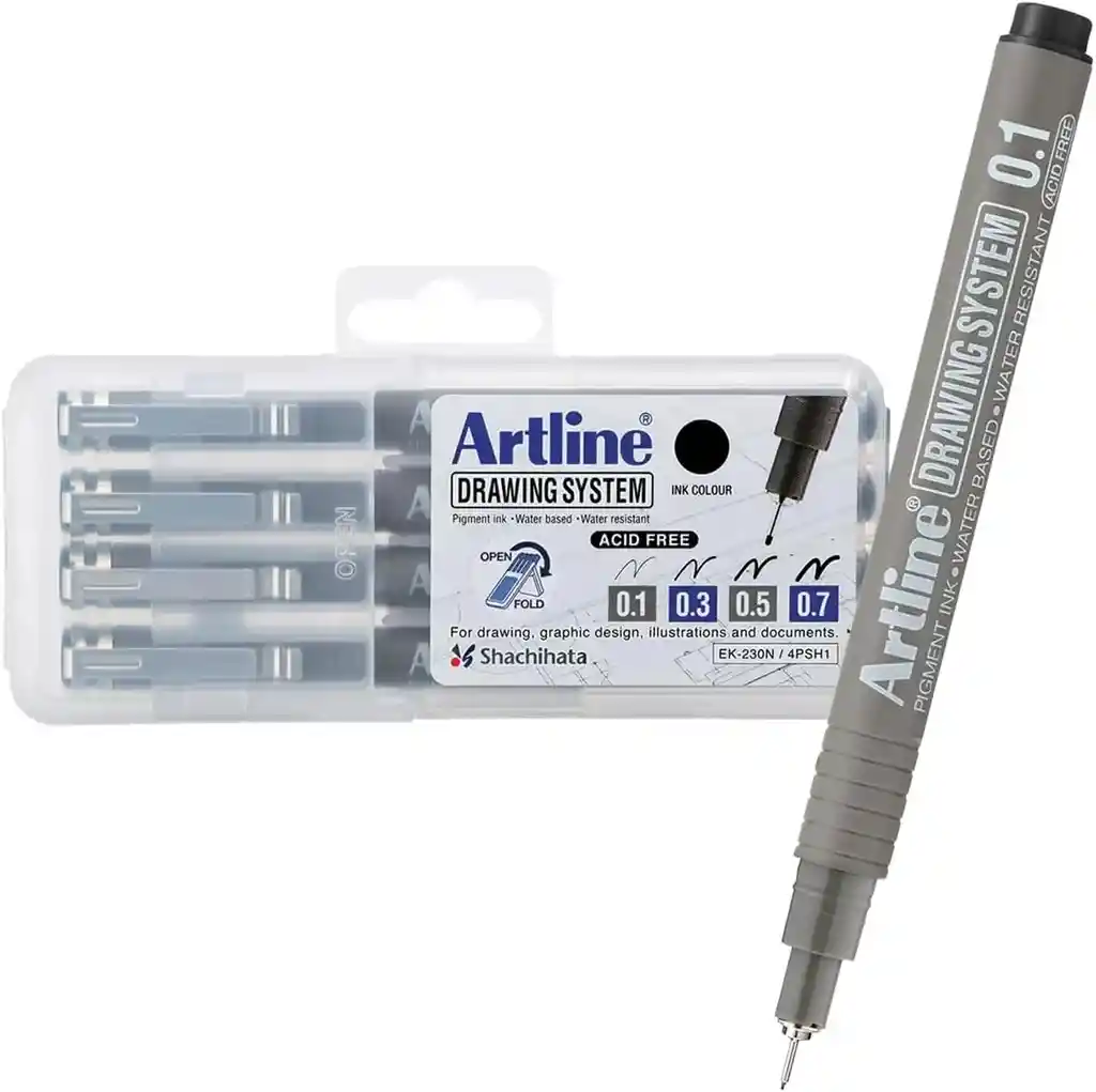 Micropunta Artline Set X 4 rapidógrafos tinta negra 0.3 0.7 impares Unidades por envase: 4 Unidades por pack: 1 Tipo de envase: Caja de plástico Formato de venta: Unidad Color de la tinta: Negro Color del exterior: Impares De todas. Tinta: indeleble. Con estuche incluido. Posee capuchón y clip.