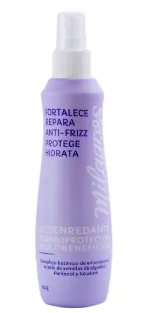 CUALIDADES: Anti Frizz Desenreda Hidrata Suaviza Acondiciona la fibra capilar Fortalece Protege Dermatológicamente e hipoalergénicamente comprobado MODO DE USO: AGITAR ANTES DE USAR *Desenredante: Aplícalo en el cabello húmedo después del baño, deja actuar por 5 minutos y peina con normalidad, inicia con las puntas y termina en la raíz. *Termoprotector: Aplícalo 10 minutos antes del cepillado o alisado para cuidar la fibra y la hebra capilar. Ideal para todo tipo de cabello