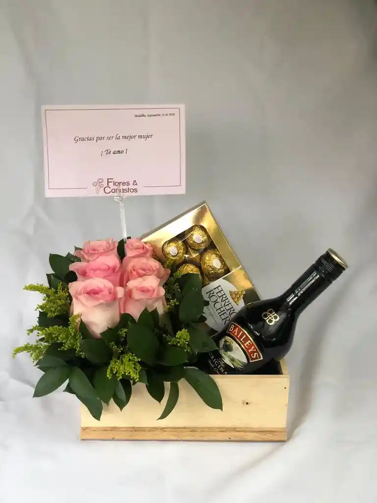 caja en madera con 6 rosas, media de Baileys y caja de chocolates Ferrero