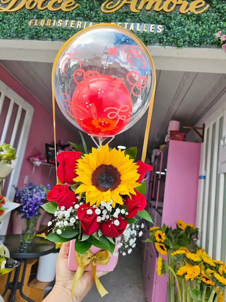 caja con 6 rosas , 1 girasol natural y globo burbuja