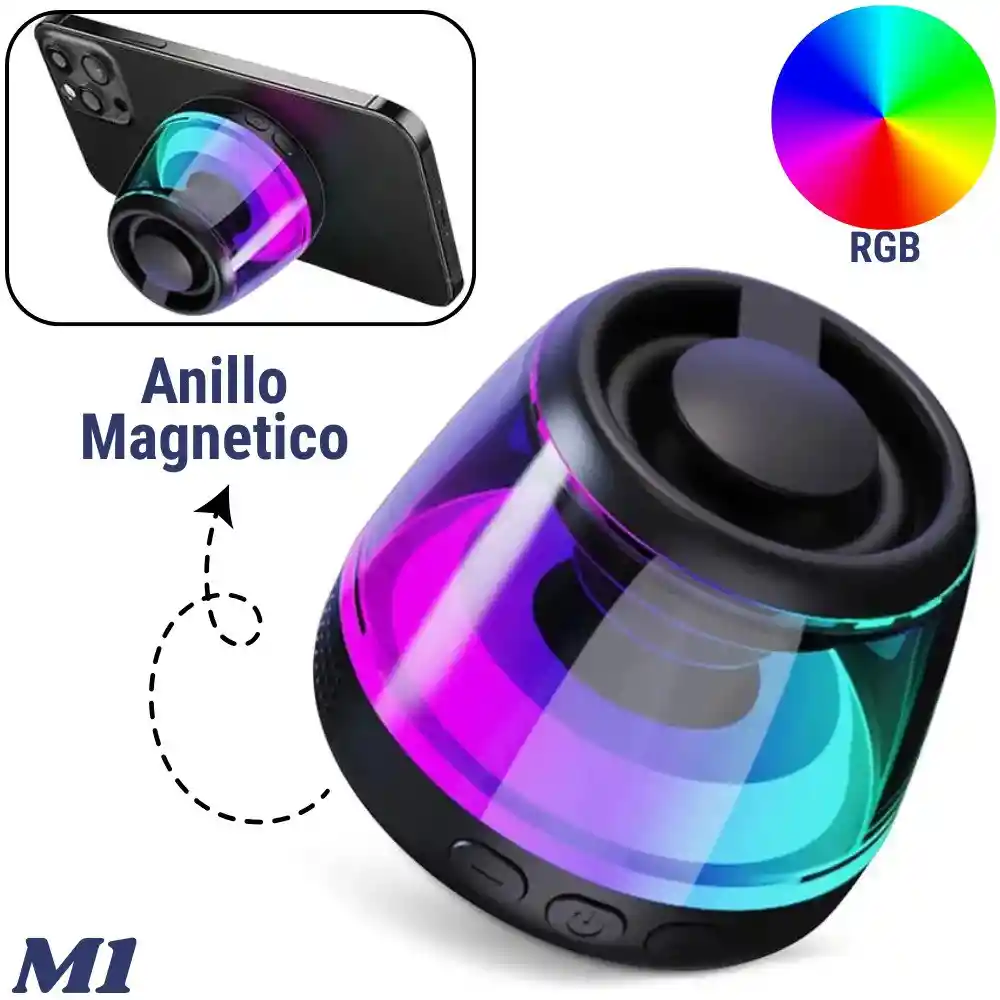 Mini Parlante Bocina Bluetooth Portatil Magnetico Recargable M1 Lleva tu música y tus videos a otro nivel con el Altavoz Bluetooth M1. Este dispositivo no es solo un parlante, es un accesorio 2 en 1 que combina un audio potente con un diseño magnético inteligente. Su carcasa transparente y luces RGB lo convierten en el complemento visual perfecto, mientras que su capacidad de adherirse a tu celular lo hace increíblemente práctico para ver películas, jugar o hacer videollamadas. Características: - Atracción Magnética: Diseñado para adherirse firmemente a la parte trasera de tu smartphone. Funciona como un soporte que te permite inclinar el teléfono para disfrutar de contenido multimedia cómodamente. - Compatibilidad Universal (Anillo Incluido): El paquete incluye una lámina magnética adhesiva que puedes pegar en cualquier teléfono o funda para hacerlo compatible al instante con el parlante. - Luces LED RGB: Crea una atmósfera única con su iluminación RGB que cambia de color, brillando a través de su carcasa transparente con un estilo futurista y llamativo. - Sonido Potente y Portátil: A pesar de su tamaño compacto, ofrece un sonido claro y envolvente. Es lo suficientemente pequeño para llevarlo en el bolsillo, pero con la potencia necesaria para animar tu entorno personal. - Ranura para Tarjeta TF/MicroSD: Reproduce tu música favorita directamente desde una tarjeta de memoria sin necesidad de usar el celular. - Controles Integrados: Botones físicos en la base para encender/apagar y controlar el volumen fácilmente. Especificaciones: Modelo: M1. Tipo: Altavoz Bluetooth Portátil Magnético. Iluminación: LED RGB Multicolor. Montaje: Anillo magnético (MagSafe compatible o mediante adhesivo incluido). Puertos: Carga (USB/Tipo-C) y Ranura para Tarjeta de Memoria.