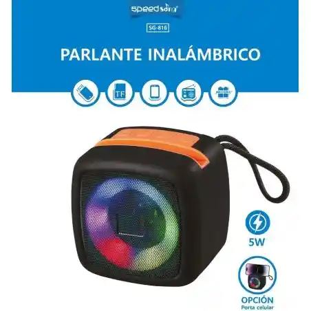 Conexión Inalámbrica Bluetooth: El Parlante SG-816 se conecta de manera inalámbrica a tus dispositivos compatibles con Bluetooth, como teléfonos, tabletas y computadoras. Esto te permite disfrutar de tu música favorita sin cables ni complicaciones. Sonido de Alta Calidad: A pesar de su tamaño compacto, el Parlante SG-816 ofrece un sonido claro y potente. Sus altavoces de alta calidad proporcionan un audio nítido y envolvente para que disfrutes de tus canciones, podcasts y llamadas con una calidad excepcional. Luces LED Multicolores: Este parlante cuenta con luces LED integradas que dan vida a tu entorno. Puedes elegir entre una variedad de modos de iluminación, desde suaves transiciones de colores hasta una luz fija en el color de tu elección. Las luces LED añaden un toque de magia a tu experiencia auditiva. Diseño Portátil y Elegante: El Parlante SG-816 tiene un diseño moderno y elegante que encajará perfectamente en cualquier ambiente. Su tamaño compacto y peso ligero hacen que sea fácil de transportar a todas partes. Además, su forma ergonómica facilita el agarre y el transporte. Batería de Larga Duración: La batería de alta capacidad garantiza horas de reproducción ininterrumpida. Ya sea en una fiesta en la playa, un picnic en el parque o simplemente relajándote en casa, el Parlante SG-816 estará a la altura de la ocasión. Conexión Auxiliar: Además de la conectividad Bluetooth, el Parlante SG-816 también dispone de una entrada auxiliar para dispositivos que no sean compatibles con Bluetooth. Incluye Cable Tipo C Color: Negro/Naranja
