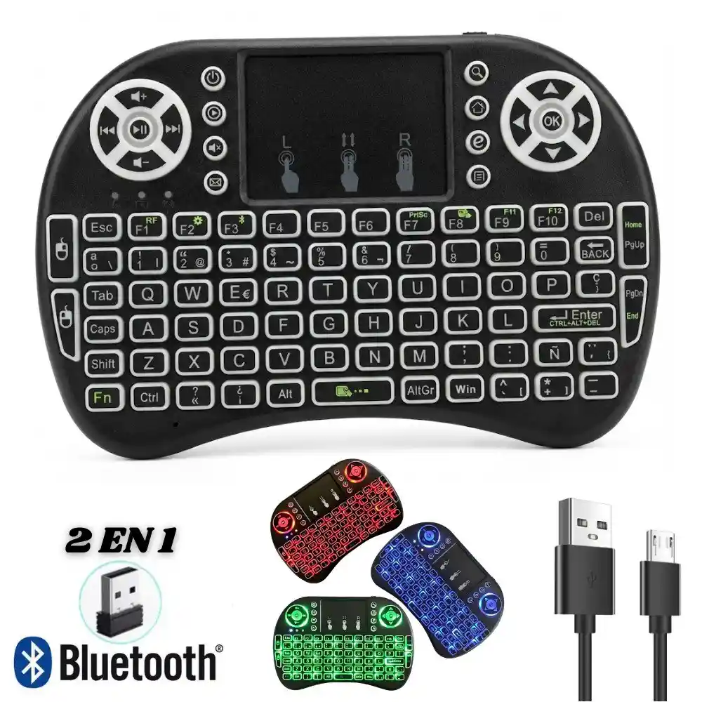 Mini Teclado Inalambrico Bluetooth Control Smart Tv Mouse Portatil ¡Olvídate de luchar con el control remoto tradicional para escribir en tu Smart TV! Con este Mini Teclado Inalámbrico 2 en 1, tendrás el control total de tus dispositivos en la palma de tu mano. Su diseño ergonómico estilo gamepad lo hace perfecto para navegar por internet, jugar, o controlar tu centro multimedia cómodamente desde el sofá. Características: - Conexión Dual (2 en 1): Versatilidad total. Modo Bluetooth: Conéctalo directamente a tu Smartphone, Tablet o Laptop sin necesidad de adaptadores. Modo USB (2.4GHz): Incluye un receptor USB para conectarlo a dispositivos sin Bluetooth como PC de escritorio, Smart TVs convencionales o TV Box. - Teclado en Español (Incluye Ñ): Este teclado viene configurado con la distribución en español, incluyendo la tecla Ñ física, facilitando la escritura de correos, búsquedas en YouTube o chats. - Touchpad Inteligente Incorporado: Funciona como un mouse. Panel táctil de alta sensibilidad que admite gestos - Retroiluminación LED (RGB): Úsalo en la oscuridad sin problemas. Cuenta con luz de fondo ajustable en 3 colores (Rojo, Azul y Verde) para que puedas ver las teclas claramente en tu noche de películas. - Controles Multimedia: Acceso rápido a volumen, reproducción, pausa, inicio, correo y buscador con sus botones laterales y teclas de función (F1-F12). - Batería Recargable: Olvídate de comprar pilas. Cuenta con una batería de litio recargable mediante cable USB (incluido). Compatibilidad Universal: Diseñado para funcionar con una amplia gama de dispositivos: Smart TVs, Android TV Box, Computadoras, Celulares, Tablets y muvho más. El Paquete Incluye: 1x Mini Teclado Inalámbrico Retroiluminado. 1x Receptor USB (Dongle inalámbrico). 1x Cable de carga (USB a Micro-USB). Manual de usuario.