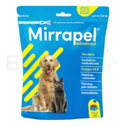 Mirrapel es un suplemento nutricional en polvo de suministro diario y oral para mascotas. Su fórmula contiene ingredientes y nutrientes de calidad que favorecerán la salud de tu mascota, ayudándolo a mantenerse saludable y vital por más tiempo. Puede ser suministrado a partir de los 2 meses de edad, así que es ideal para perros cachorros, adultos, senior y gatos. Esta presentación de Mirrapel en polvo es muy fácil de usar, ya que puede ser espolvoreado en el alimento y se adherirá muy bien en las croquetas.