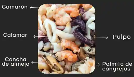 Mix de mariscos, acompañado de camaron,pulpo,calamar,palmitos,almeja