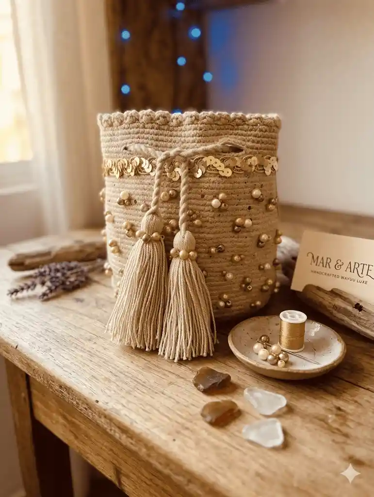 Mochila Wayúu pequeña de diseño color beige, recamada con detalles dorados. Gaza reforzada