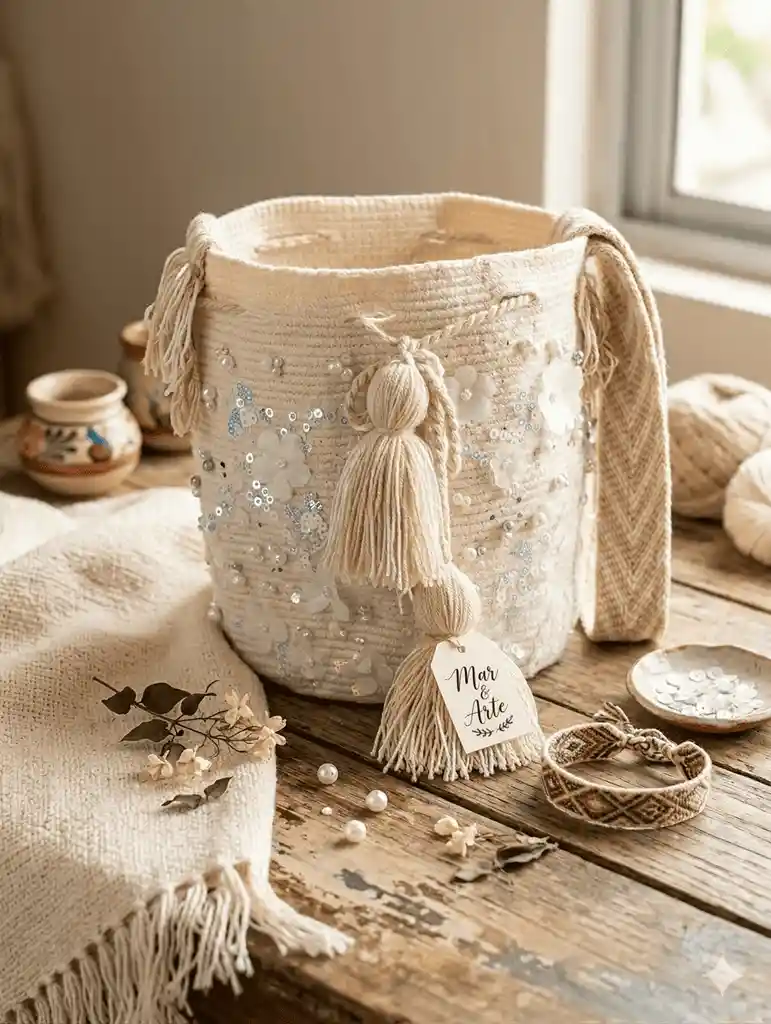 Mochila Wayúu mediana de diseño blanca, recamada con detalles plateados y blancos. Gaza reforzada