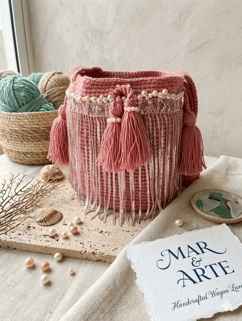 Mochila Wayúu pequeña de diseño color rosa, recamada con flecos, perlas blancas y rosadas. Gaza reforzada