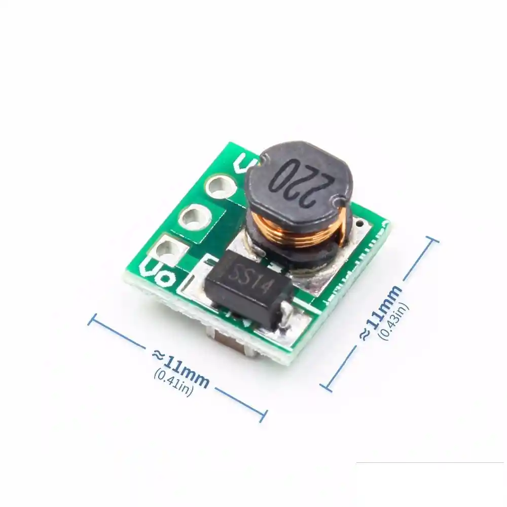 Voltaje de entrada: 0.9-5V; voltaje de salida: 5V 2. Corriente de salida maxima: 480mA 3. Puesta en marcha de voltaje: 0.8V; corriente de salida: 7mA 4. Voltaje de entrada: 1-1.5V; voltaje de salida 5V; corriente 40-100mA 5. Tension de entrada: 1.5-2V; tension de salida 5V; corriente 100-150mA Voltaje de entrada: 2-3V; voltaje de salida 5V; corriente 150-380mA 7. Voltaje de entrada:> 3V; voltaje de salida 5V; corriente 380-480mA 8. Frecuencia de funcionamiento: 150 KHz 9. Eficiencia de conversion tipica: 85% 10. espacio en blanco: 2.54mm 11. Tamaño: 11 * 10.5 * 7.5 mm Darse cuenta: 1. La tension de entrada no debe ser mayor que la tension nominal, o el modulo se quemara 2. La potencia de entrada debe superar la potencia de salida, o el voltaje de salida sera menor que el voltaje nominal 3. La carga de salida no debe ser mayor que la carga nominal, o el voltaje de salida sera menor que el voltaje nominal LA COMPRA INCLUYE: 1 x MODULO ELEVADOR Y REDUCTOR 0.9-5V a 5v 480mA 5V CONSTANTE