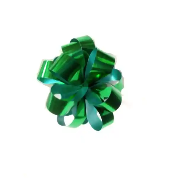 Moño decorativo en cinta de papel metalizada de 1,5cm de ancho color verde. El moño viene con amarre y tiene un tamaño de 8-9cm. Listo para decorar cajas, regalos y demás.