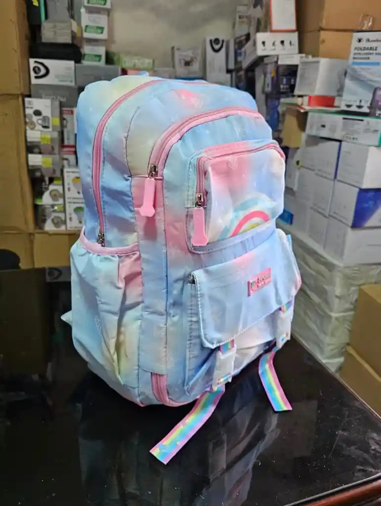 Morral escolar con diseño infantil en tonos pastel, combinando azul, rosa y detalles degradados estilo arcoíris. Su apariencia suave y colorida lo hace ideal para niñas que aman los diseños tiernos y llamativos. Perfecto para uso diario en el colegio o para salidas. Tamaño 47 X 30 X 19CM --- Características destacadas ✨ Diseño colorido y tierno: Estampado pastel con detalles de arcoíris y figuras suaves. Cierres y cremalleras en tono rosado, fáciles de abrir. 🎒 Amplio espacio y organización: Dos compartimentos principales de gran capacidad para cuadernos, libros y carpetas. Bolsillo frontal mediano con diseño de arcoíris. Bolsillo frontal pequeño con tapa, ideal para accesorios. Bolsillos laterales para botellas de agua u objetos pequeños. 🧵 Material resistente y ligero: Tela suave estilo satinado, fácil de limpiar. Costuras reforzadas para mayor durabilidad. 🎀 Detalles especiales: Tirantes con diseño arcoíris multicolor. Etiqueta frontal “Sport Girl”. Asa superior para cargar con la mano. 🎒 Comodidad: Correas ajustables y acolchadas para mayor confort. Respaldo acolchonado