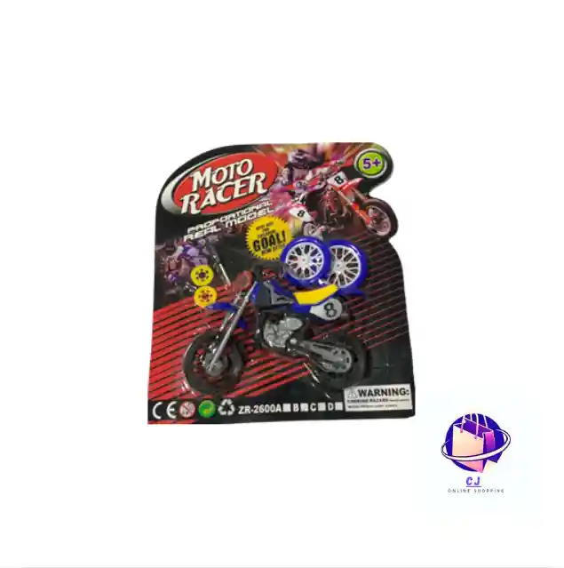 Motocicleta de juguete con diseño deportivo tipo carreras, fabricada generalmente en plástico o metal con ruedas móviles.