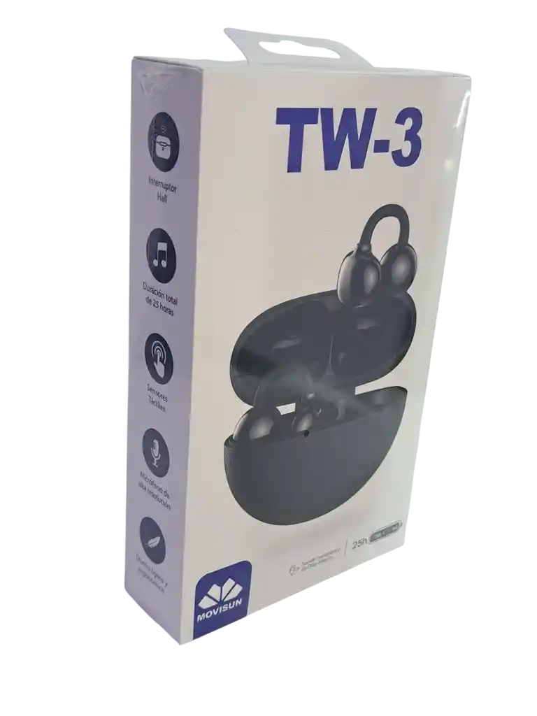 Manos libres bluetooth tipo piercing. Duración de la carga 5 horas, el estuche proporciona cuatro cargas adicionales. El puerto de carga es tipo C.