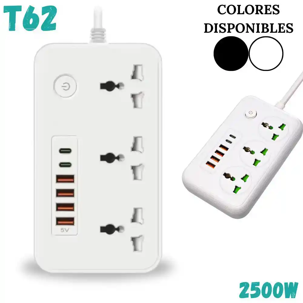 El Multitoma de Corriente con Puertos USB + Tipo C Power Socket 2500W 4.1A T62 es un dispositivo diseñado para ofrecer una solución de energía eficiente y conveniente en espacios donde se necesitan múltiples conexiones eléctricas. Este multitoma incluye: - Tres tomas de corriente estándar: Permite conectar varios dispositivos electrónicos, como computadoras, cargadores, lámparas, etc., con una capacidad total de hasta 2500W. Esto la hace ideal para oficinas, hogares o áreas de trabajo donde se necesiten varias fuentes de energía simultáneas. - Puertos USB de carga: Equipado con 4 puertos USB que permiten cargar dispositivos móviles, como smartphones, tabletas o dispositivos similares, de manera rápida y eficiente. En total, los puertos USB ofrecen una salida de 4.1A, proporcionando una carga rápida para tus dispositivos. - Puerto USB Tipo C: Incluye también 2 puertos USB Tipo C, ideal para dispositivos más modernos, como laptops, smartphones y otros equipos que usan este tipo de conector para carga rápida. - Seguridad y calidad: El modelo T62 tiene una construcción robusta que garantiza una operación segura y confiable. Además, está diseñado para soportar cargas de hasta 2500W, lo que lo hace adecuado para dispositivos de alto consumo energético.