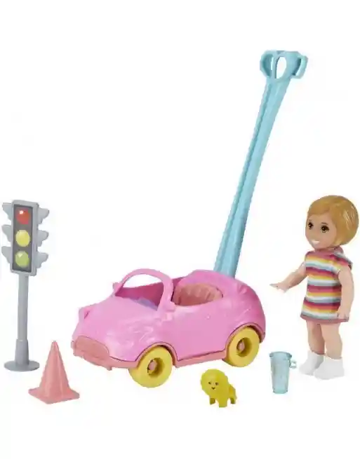 Las muñecas y juguetes Barbie Skipper Babysitters Inc. permiten que las niñas exploren su lado cariñoso como niñeras. ¡Este juego está diseñado para despertar la narración de historias con una pequeña muñeca para niños pequeños que cuidar y un auto de juguete de su tamaño que permitirá que los niños se diviertan mientras juegan! El auto rosa tiene ruedas que giran y una manija que la niñera puede empujar. Viene con un semáforo, un cono, una taza y un león de juguete para inspirarte aún más. Algunas de las piezas también tienen un asa que la muñeca puede sujetar para divertirse jugando. Los niños pueden coleccionar todas las muñecas y juguetes de Barbie Skipper Babysitters Inc. para explorar aún más las posibilidades del juego de roles y la narración de historias (cada uno se vende por separado, sujeto a disponibilidad). Incluye una muñeca pequeña para niños pequeños, una pieza de cocina y cuatro accesorios. La muñeca no puede estar sola. Los colores y las decoraciones pueden variar. Tipo de cabello