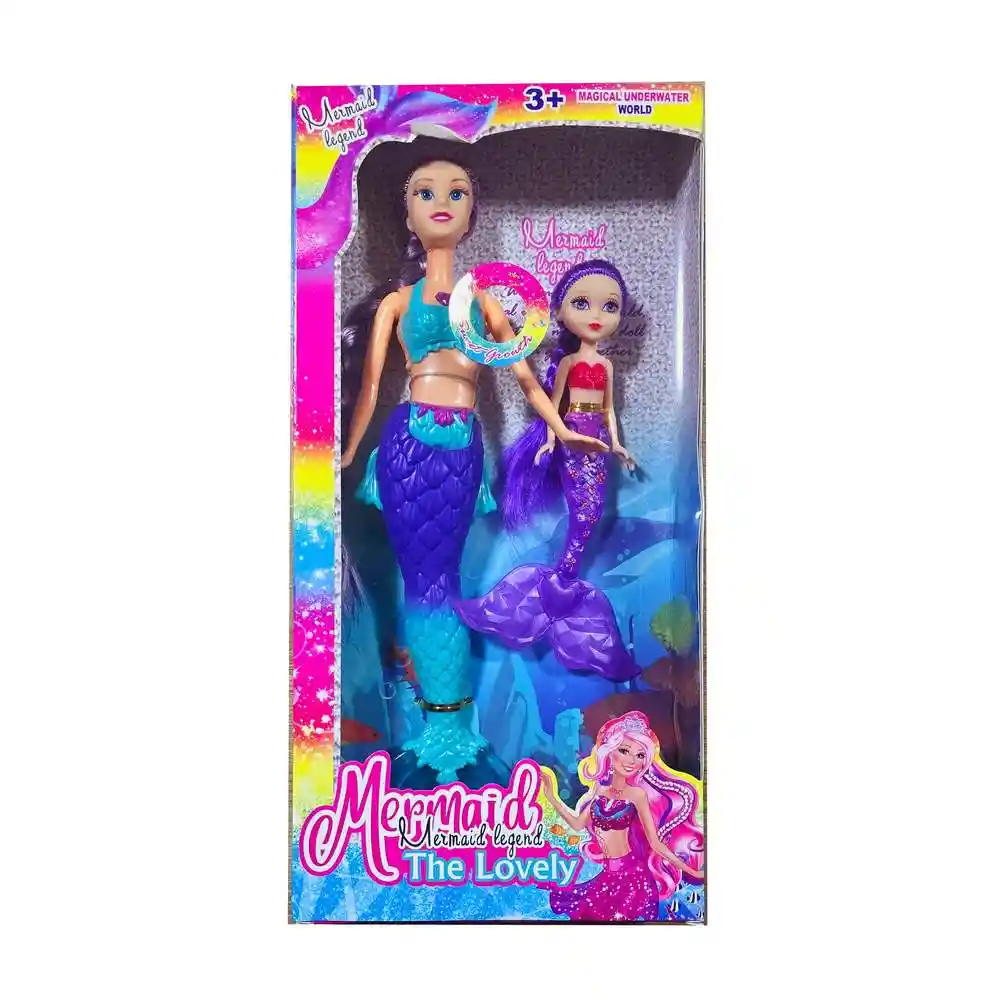 Sumérgete en un mundo de fantasía con esta muñeca de sirena con una deslumbrante cola multicolor, acompañada de una muñeca más pequeña que representa a su hija, también con una encantadora cola de sirena. Juntas, forman un dúo perfecto para crear emocionantes aventuras bajo el mar, fomentando la imaginación y el juego creativo, mientras exploran océanos mágicos y descubren tesoros escondidos en las profundidades. Ficha Técnica: Dimensiones de la muñeca: 29 cm x 9 cm Dimensiones del empaque: 32 cm x 12 cm x 6 cm Material: Plástico ABS no toxico Edad recomendada + 3 Años Certificado de conformidad: CS-LCO-13233-2021S2/432 Referencia: 619A1 ** _Para defectos de fábrica o retractos: \_Por favor revise el producto apenas lo reciba y antes de usarlo. No aplican ley de retracto o defectos de fábrica luego de usar el producto. Se manejan máximo 5 días para reportar defectos de fábrica (por ejemplo, producto funciona mal, piezas faltantes, rotas, etc). Para hacer efectiva la devolución el producto debe devolverse con el empaque original, el cual debe estar en buen estado, incluir todos los documentos y las partes completas y sin daños.